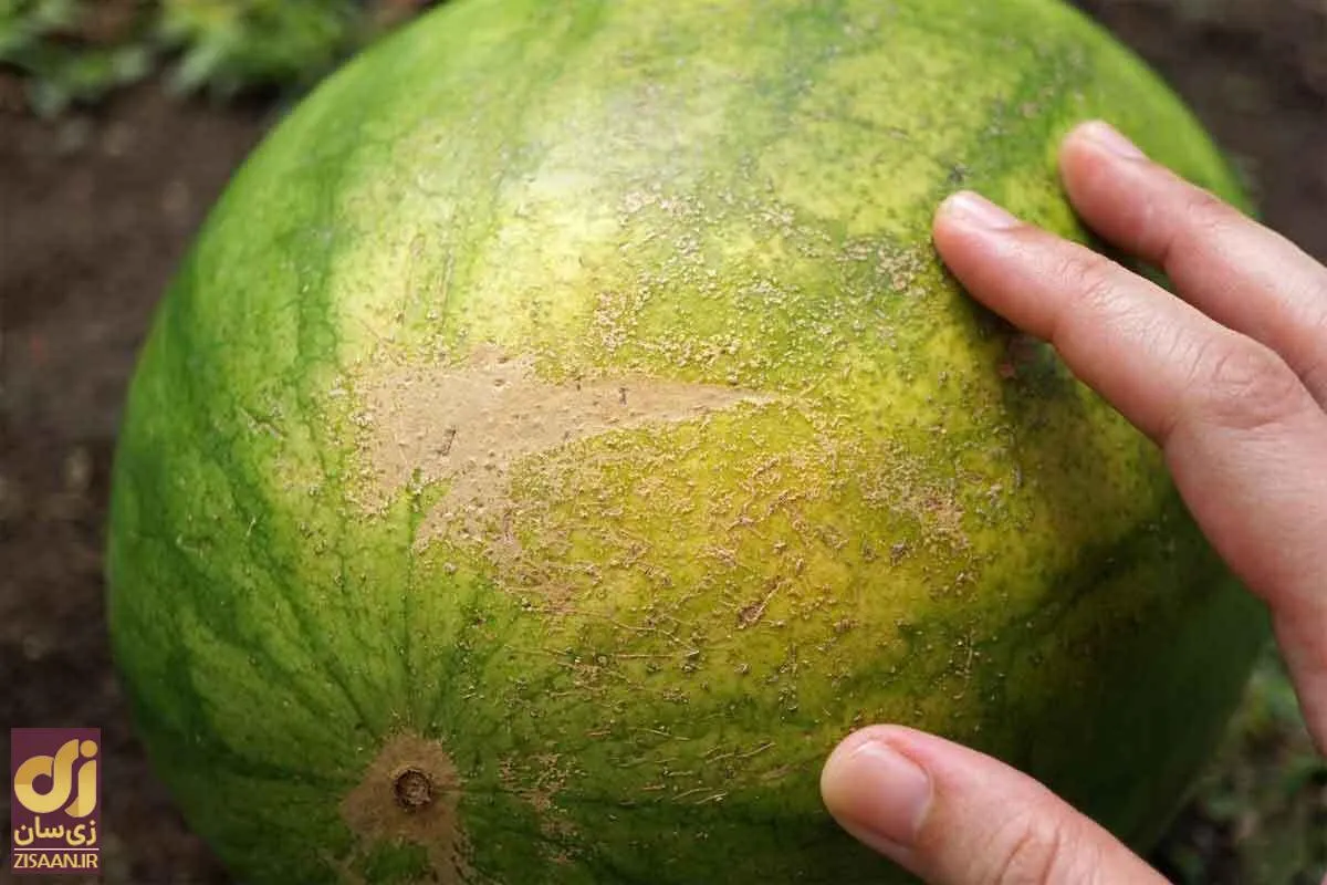 این علامت‌گذاری نشان می‌دهد که هندوانه هنگام رسیدن، خم شده و روی زمین نشسته است. به عنوان یک قاعده کلی، این تغییر رنگ باید زرد مایل به کرم یا نزدیک به نارنجی باشد که نشان دهنده یک هندوانه خوش‌طعم است. اگر این منطقه سفید یا زرد روشن بود، بهتر است یکی‌دیگر را انتخاب کنید. لکه‌های روشن این منطقه نشان‌دهنده یک هندوانه فاقد طعم‌اند.