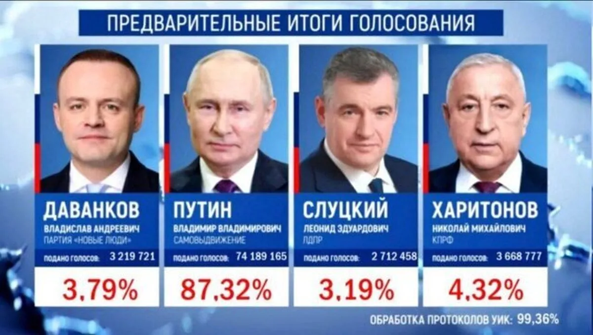 بر اساس گزارش کمیسیون مرکزی انتخابات، بیش از ۹۹.۵ درصد آرا تا ساعت ۷ صبح به وقت مسکو شمارش شده و پوتین با ۸۷.۳۲ درصد پیشتاز رقابت‌های ریاست‌جمهوری ۲۰۲۴ است.