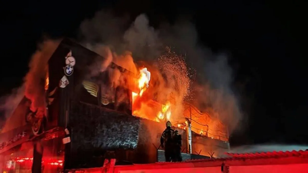 فیلم تصویری از آتش‌نشانان را نشان می‌دهد که در تلاش برای اطفای حریق انبار مواد غذایی تهران هستند.