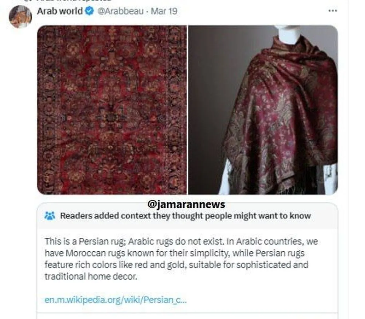 هشدار «ایکس» به خوانندگان یک پیج عربی: این فرش ایرانی است!