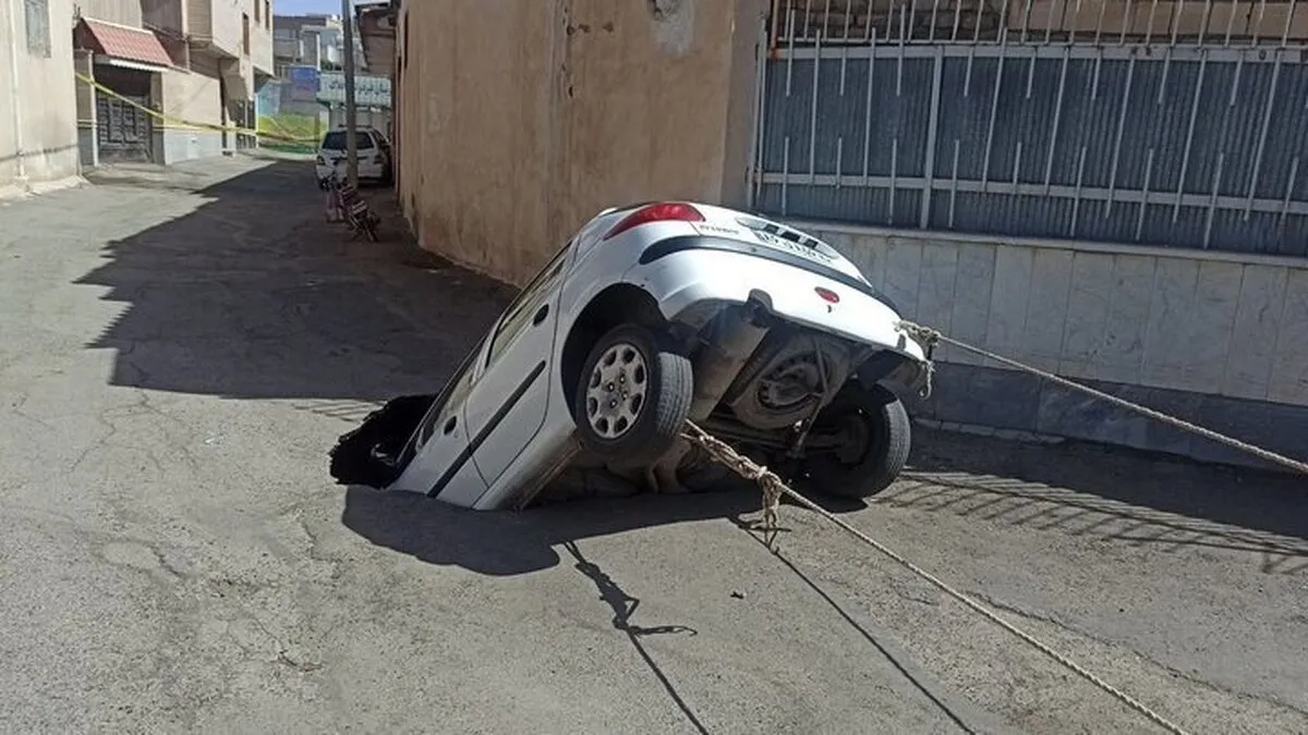 (ویدئو) تصاویر عجیب و هولناک از بلعیده شدن پژو ۲۰۶ در کرج