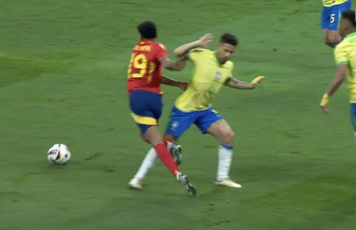 یامال، ستاره جوان اسپانیا، که درون محوطه جریمه صاحب توپ شده بود، بعد از عبور از وندل، قصد داشت از ژوائو گومس هم رد شود که بازیکن برزیلی پایش را مقابل او قرار داد و یامال ناگهان خود را نقش زمین کرد.