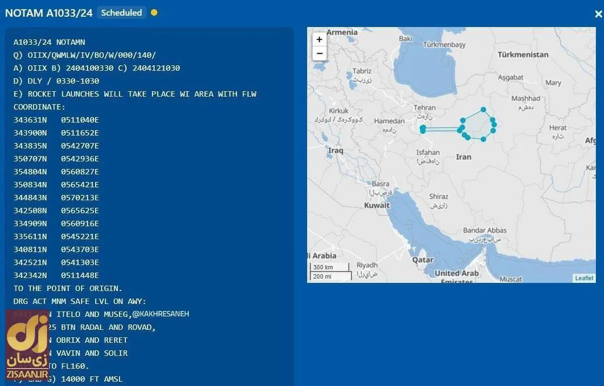بر اساس هشدار هوایی رسمی (نوتام) ایران از ساعت ۳:۳۰ بامداد فردا تا ساعت ۱۰:۳۰ صبح جمعه در منطقهای که در تصویر مشخص شده تست موشکی خواهد داشت
