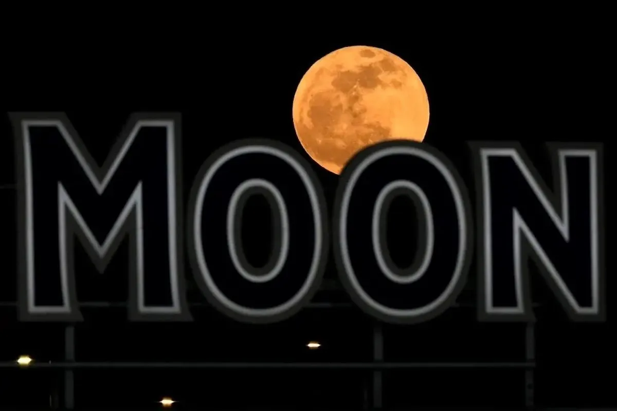 ماه کامل برفراز بیلبوردی از نام «ماه» (Moon) در محوطه بیرونی ورزشگاه کافمن