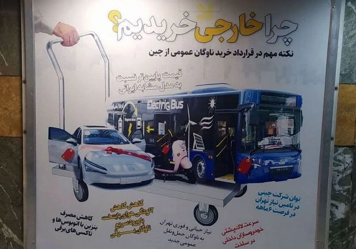 روی بنر تبلیغاتی شهرداری در ایستگاههای مترو که در توضیح و تبیین علت خرید محصول از خارج طراحی شده است، در پاسخ به سوال «چرا خارجی خریدیم؟» و دفاع از تجهیز ناوگان حمل و نقل با محصولات وارداتی از چین نوشته شده است: «قیمت پایینتر نسبت به مدل مشابه ایرانی»، «توان شرکت چینی در تامین نیاز تهران در فرصت شش ماهه»، «سرعت لاکپشتی خودروسازان داخلی در ساخت»، «نیاز فوری و حیاتی تهران به ناوگان حمل و نقل عمومی جدید»، «کاهش آلودگی هوای پایتخت با ورود سریع ناوگان برقی» و «کاهش مصرف بنزین با اتوبوسها و تاکسیهای برقی در کشور»!