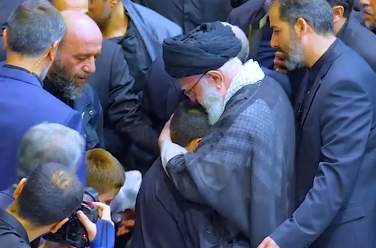 رهبر انقلاب بعد از اقامه نماز بر پیکر شهید سید ابراهیم رئیسی دو نوه رئیس‌جمهور شهید را در آغوش گرفتند.