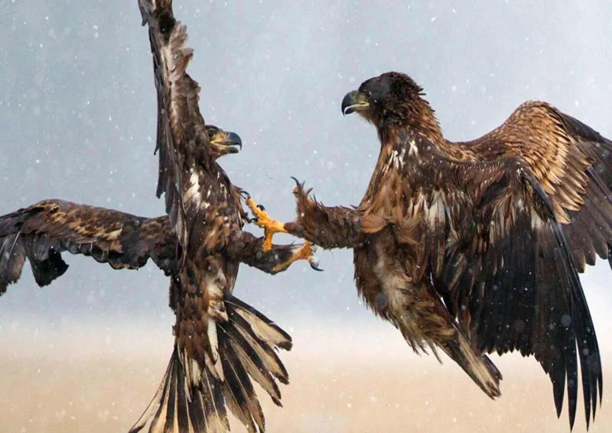 دو عقاب در نبردی جالب در دل آسمان با یکدیگر پنجه در پنجه شدند.