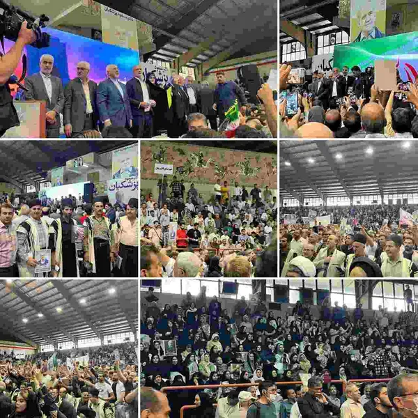 تصاویر شهید رئیسی و امیرعبداللهیان در میتینگ انتخاباتی مسعود پزشکیان در اصفهان