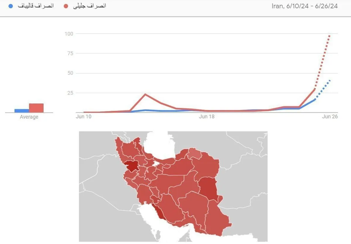 بر اساس آمار گوگل ترند، جستجو خبر انصراف جلیلی (خط قرمز) در ساعات پایانی تبلیغات بشدت صعودی شده است! بر اساس تحلیل هوش مصنوعی از ذهنیت و جو حاکم بر جامعه، گویا امیدواری به انصراف جلیلی بشدت افزایش یافته است.