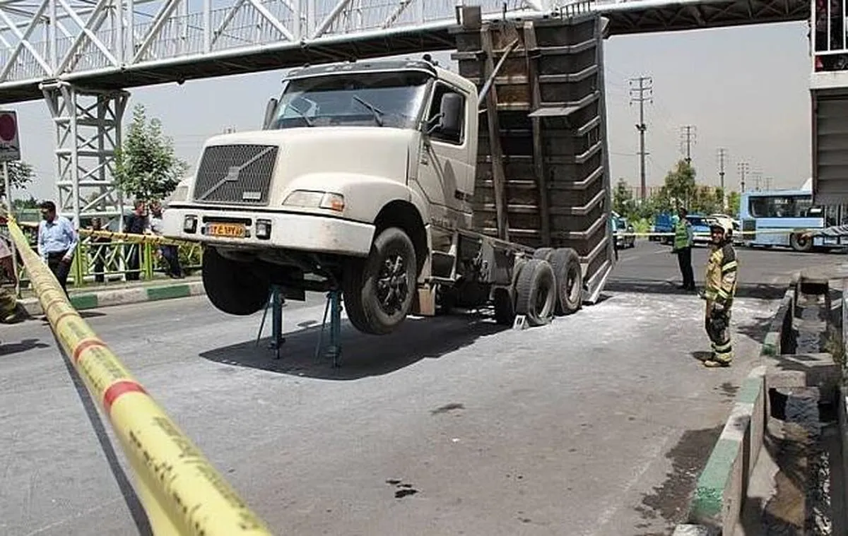 عکس| گیرکردن عجیب یه کامیون تو تبریز زیر پل عابر پیاده
