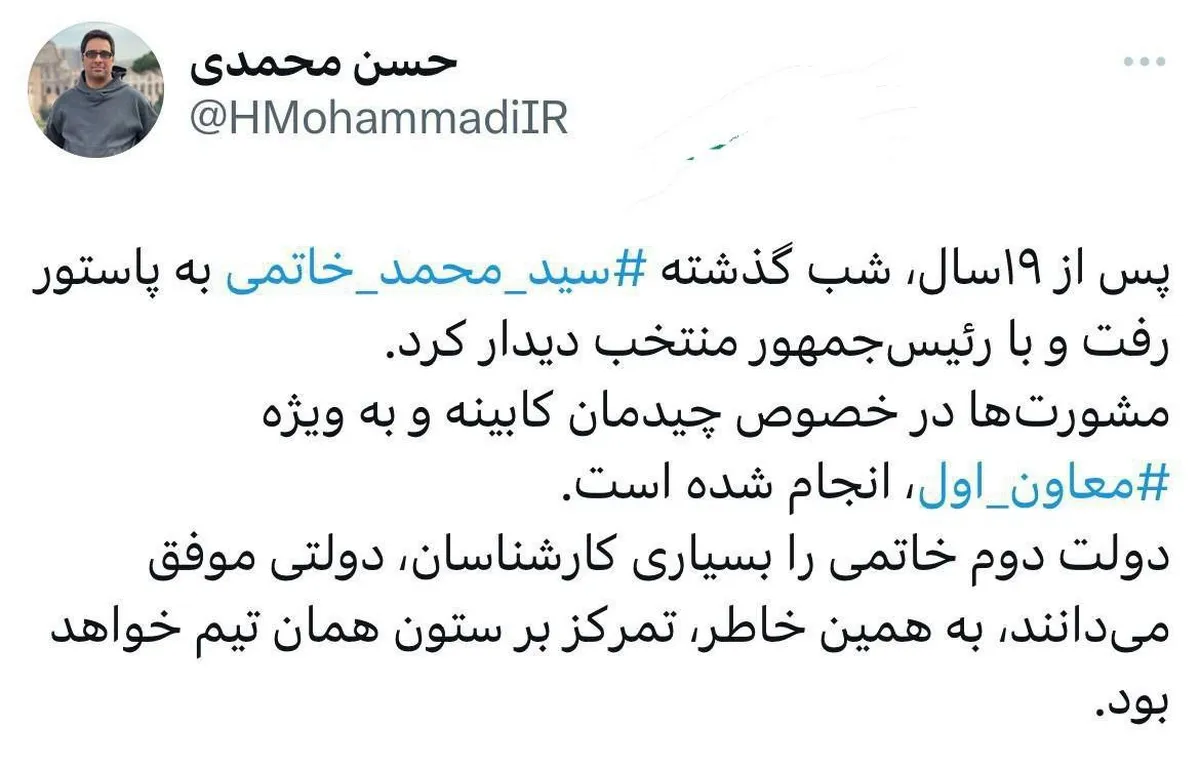 حسن محمدی، فعال رسانه‌ای با انتشار توییتی از حضور سید محمد خاتمی در پاستور پس از ۱۹ سال خبر داد.