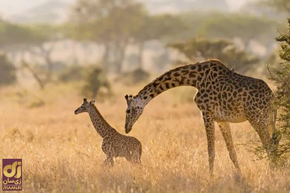 تصویر زیر یک زرافه را نشان می‌دهد که به شکل عجیبی از زرافه دیگر آویزان شده است.