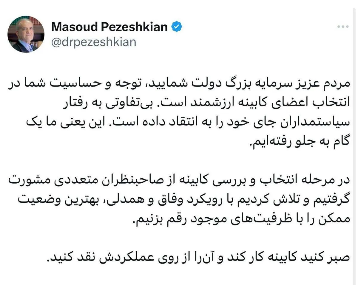 رئیس‌جمهور: مردم عزیز سرمایه بزرگ دولت شمایید، توجه و حساسیت شما در انتخاب اعضای کابینه ارزشمند است. بی‌تفاوتی به رفتار سیاستمداران جای خود را به انتقاد داده است. این یعنی ما یک گام به جلو رفته‌ایم.