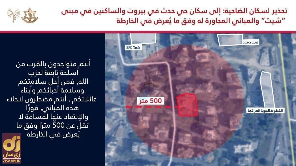 ارتش رژیم اسرائیل از مردم خواست به سرعت از این سه ساختمان در ضاحیه بیروت حداقل ۵۰۰ متر فاصله بگیرند