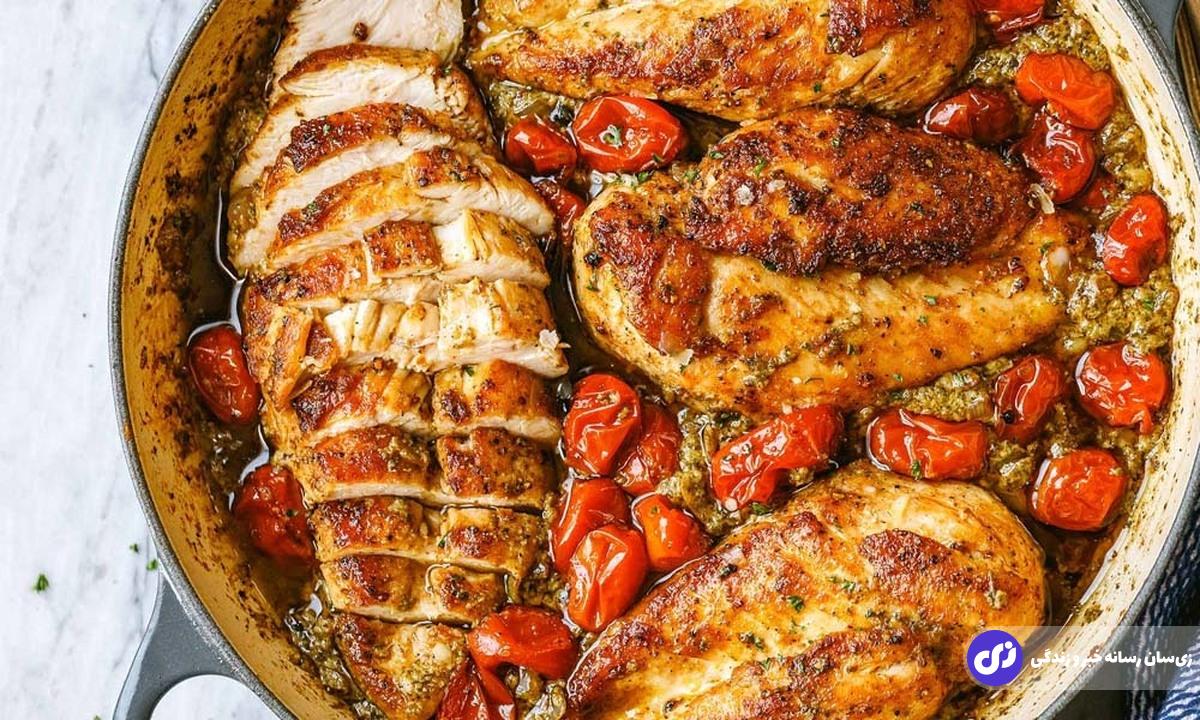 مرحله آخر: بعد از ۵ دقیقه تکههای مرغ را از فر خارج کنید و روی آنها سس پستو بریزید. در نهایت این غذای خوشمزه را با گوجه و پیازچه سرو کنید.