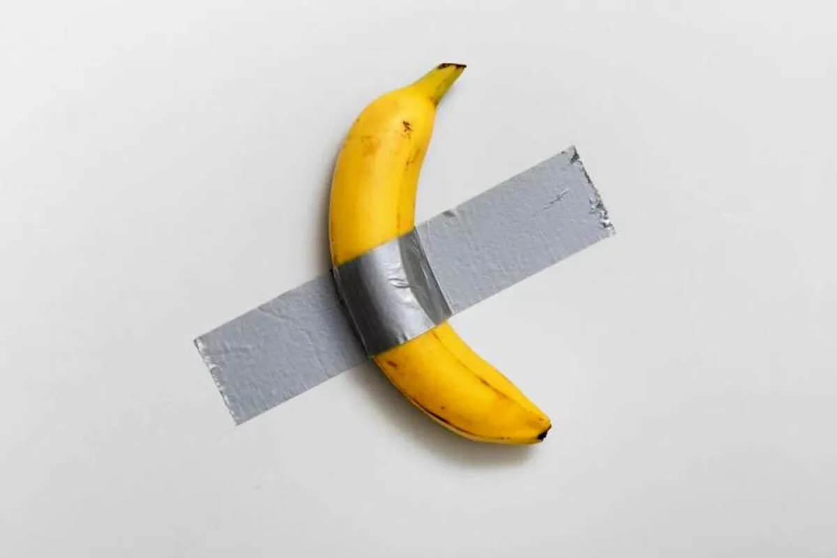این موز زرد که با نوارچسب نقره‌ای به دیوار سفید چسبانده شده است اثری هنری با عنوان «کمدین» از ماوریتسیو کاتلان، هنرمند ایتالیایی، است