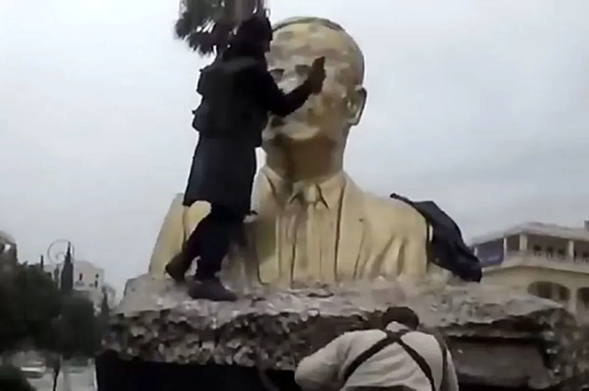 ویدئو | سرنگون کردن مجسمه حافظ اسد در شهر حماه سوریه توسط تروریست‌ها