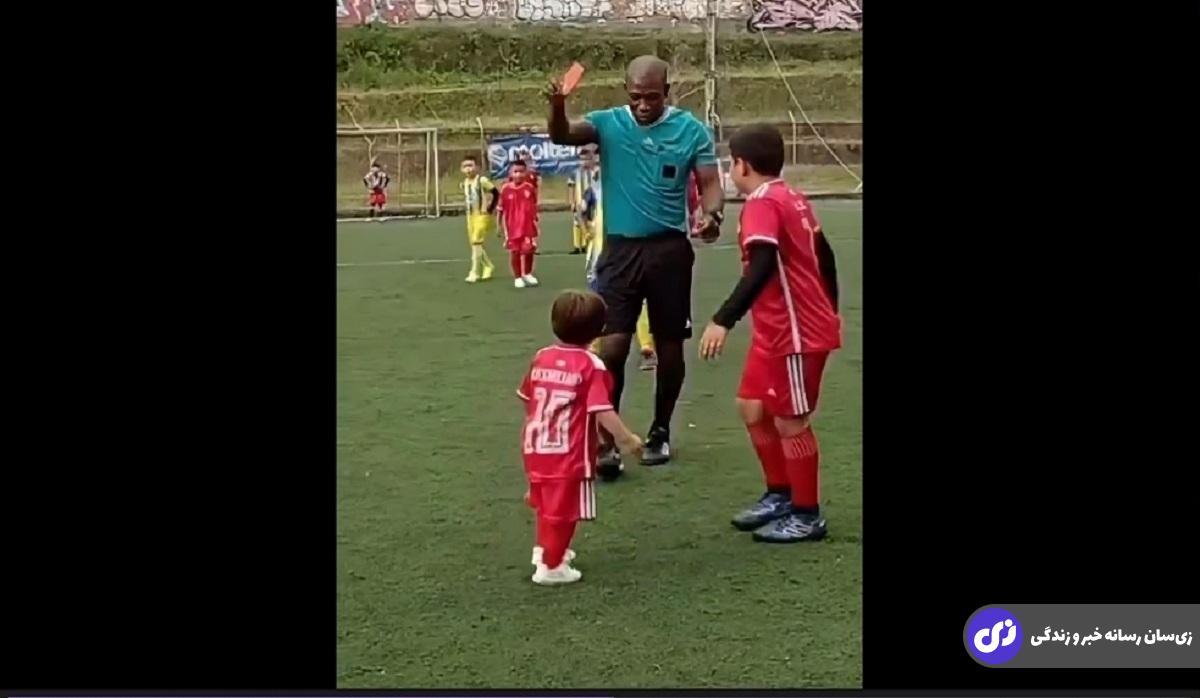در حین برگزاری یک بازی فوتبال مدرسهای یک پسربچه خردسال از وارد زمین شد.