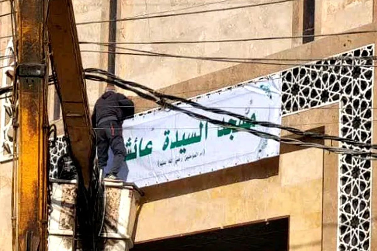 تصویری از تغییر نام مسجد امام خمینی(ره) به مسجد سیده عایشه در منطقه زینبیه دمشق به دست نیروهای تحریر الشام را مشاهده می‌کنید.
