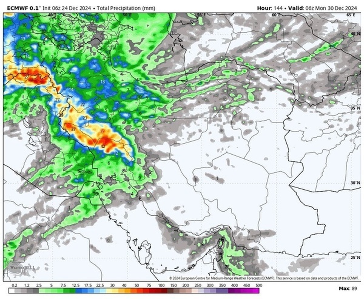 مدل هواشناسی اروپایی ECMWF پیشبینی کرده که انتهای هفته جاری موج بارشی از غرب به ایران میرسد. گستره این موج تا از شمال تا شمال شرق نفوذ کرده و نواحی از مرکز و جنوب کشور را نیز تکمیل میکند. مناطقی از بوشهر و هرمزگان نیز از باران این موج جدید بارشی منتفع خواهند شد.