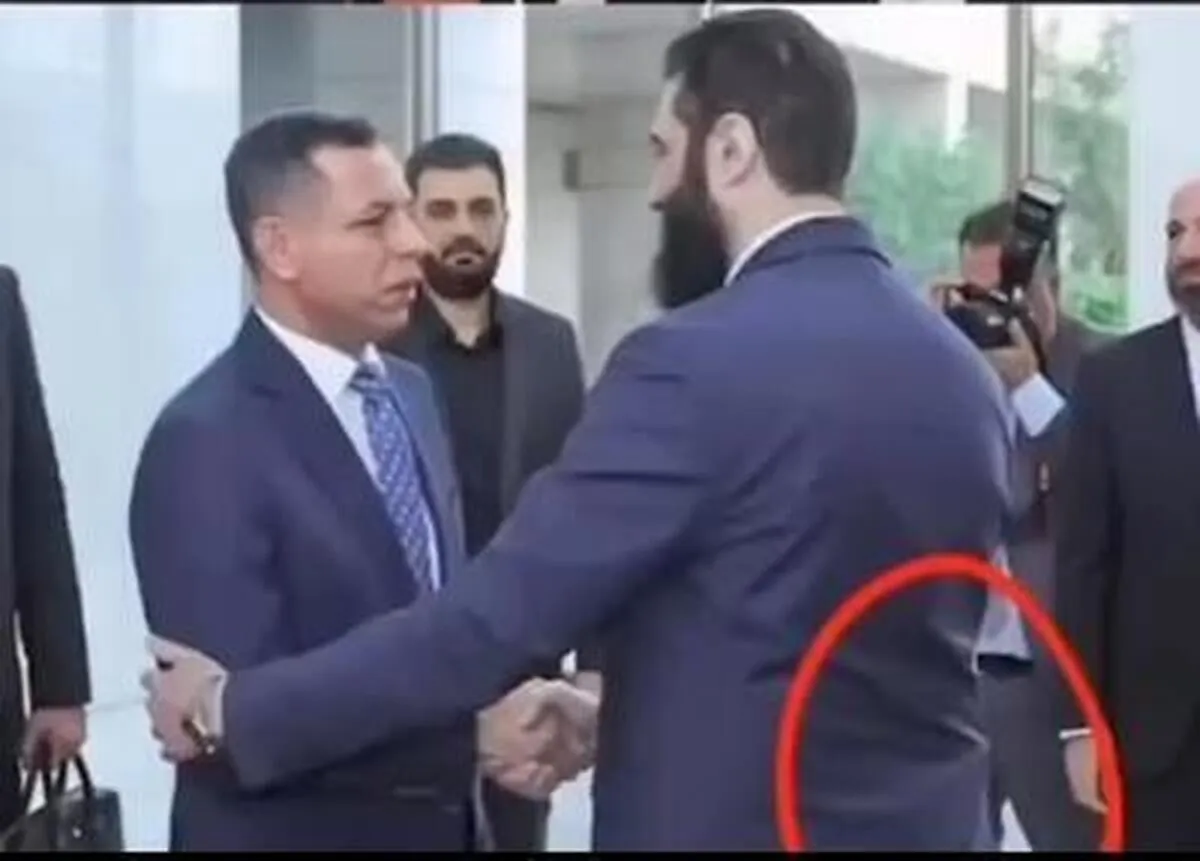 تصویری از جولانی که مورد توجه کاربران فضای مجازی قرار گرفت که نشان میدهد جولانی سرکرده تحریرالشام در دیدار با رئیس دستگاه اطلاعاتی عراق، اسلحه حمل کرده است!