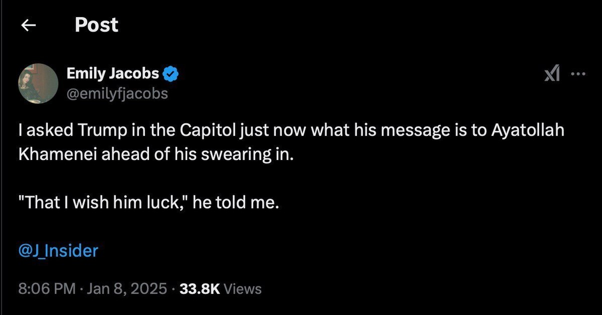 عصرایران: امیلی جاکوبز (Emily Jacobs) روزنامهنگار آمریکایی در شبکه ایکس نوشت: من همین حالا در کنگره از ترامپ پرسیدم پیامش برای آیتالله خامنهای قبل از مراسم تحلیف چیست؟
