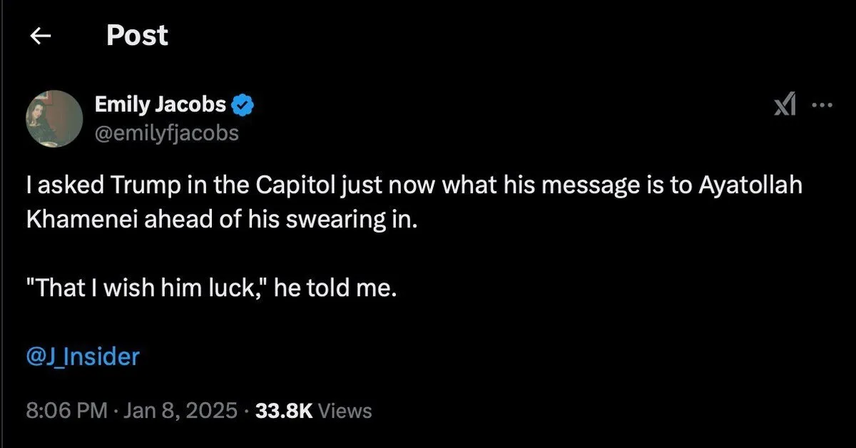 عصرایران: امیلی جاکوبز (Emily Jacobs) روزنامه‌نگار آمریکایی در شبکه ایکس نوشت: من همین حالا در کنگره از ترامپ پرسیدم پیامش برای آیت‌الله خامنه‌ای قبل از مراسم تحلیف چیست؟