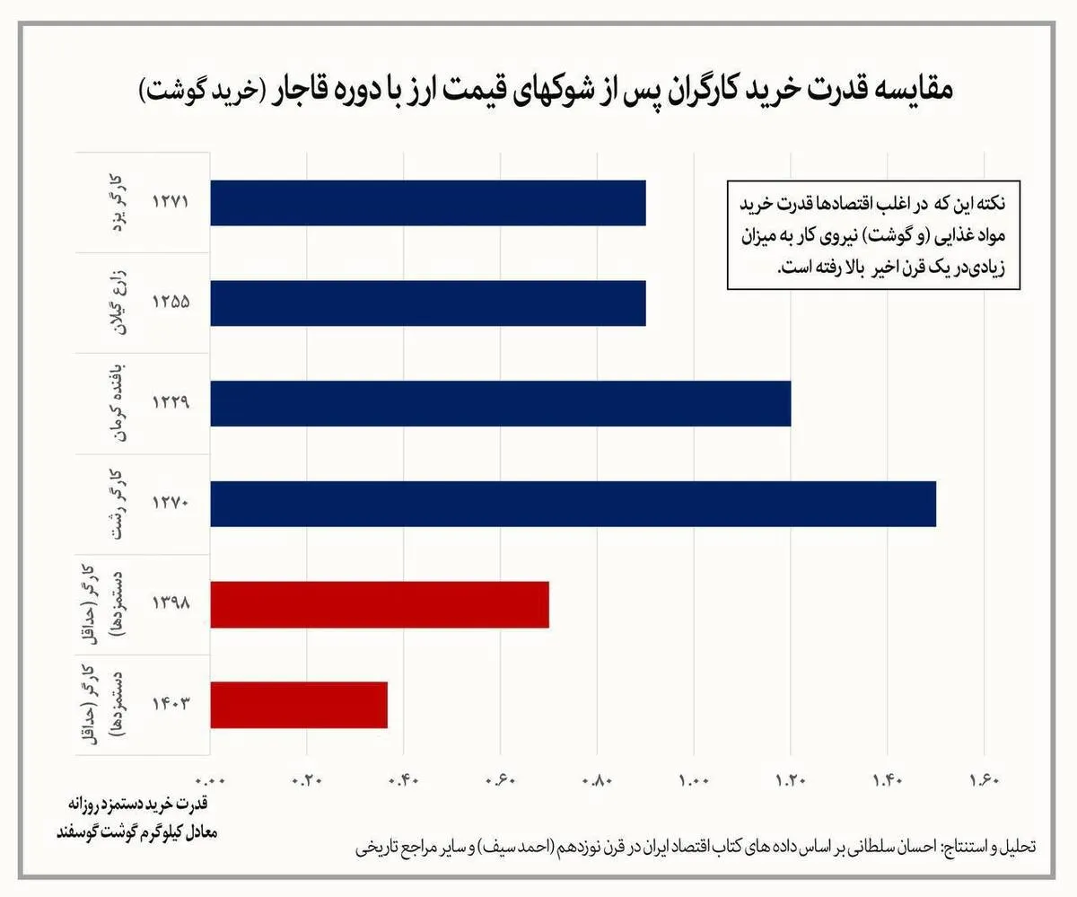 احسان سلطانی پژوهشگر اقتصادی نوشت:قدرت خرید گوشت به نصف ۱۳۹۸ و یک-سوم دوران قاجار رسیده که با افزایش قیمت گوشت در سال آینده به شدت کاهش خواهد یافت.