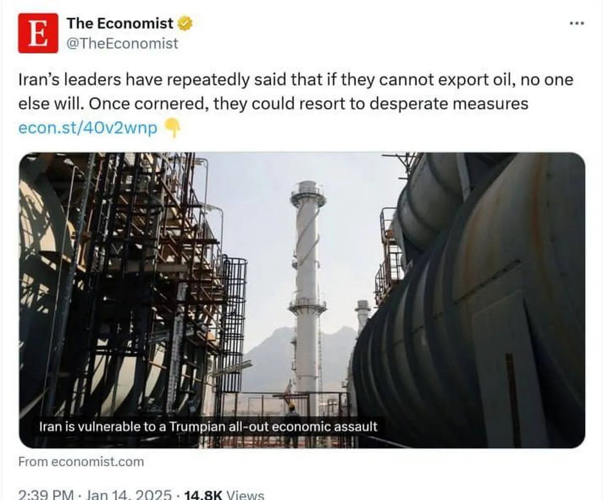 به گزارش اکونومیست، تحلیلگران معتقدند که این اقدامات ممکن است صادرات نفت ایران را تا تابستان سال ۲۰۲۵ به یک میلیون بشکه در روز کاهش دهد.