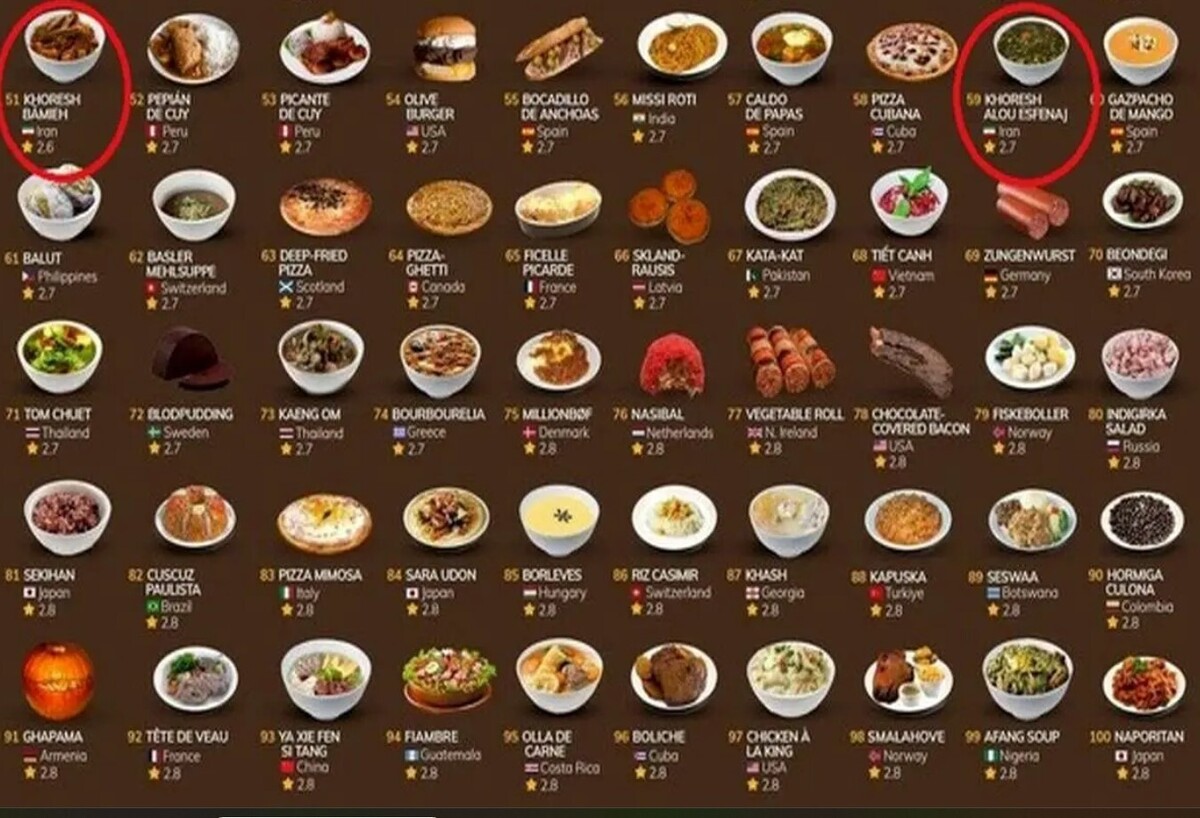 «خورش بامیه» و «خورش آلواسفناچ» به ترتیب در جایگاه پنجاه‌و‌یکم و پنجاه‌و‌نهم بدترین غذا‌های جهان در وب‌سایت TasteAtlas قرار گرفتند.