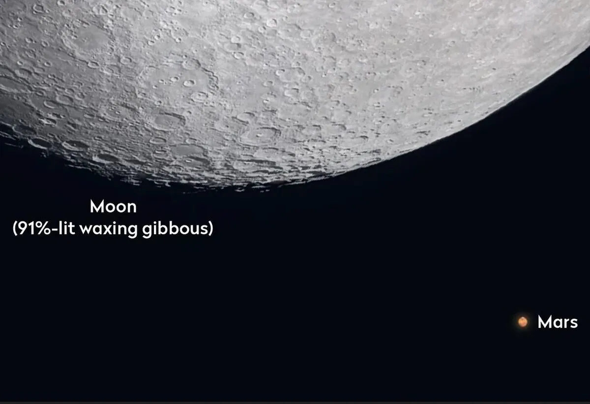 اگر امشب، ۹ فوریه ۲۰۲۵ (۲۱ بهمن) و بامداد فردا به ماه نگاه کنید، سیاره سرخ را در کنار ماه میبینید که منظرهای ایجاد میکند که با چشم غیرمسلح قابل مشاهده است.