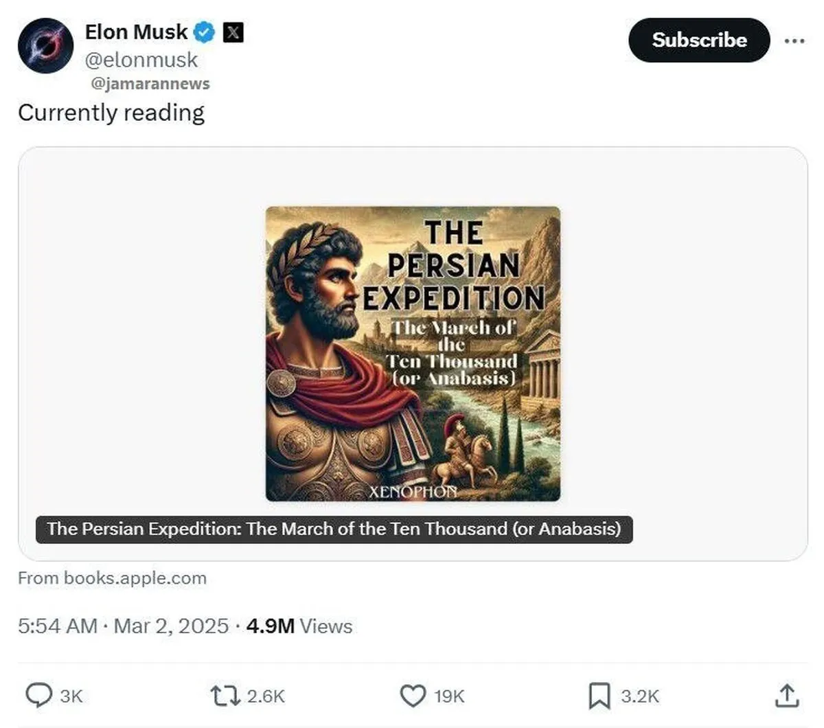 فرهیختگان نوشت: ایلان ماسک با انتشار پستی در شبکه اجتماعی ایکس گفته مشغول خواندن کتاب «The Persian Expedition: The March of the Ten Thousand» است.
