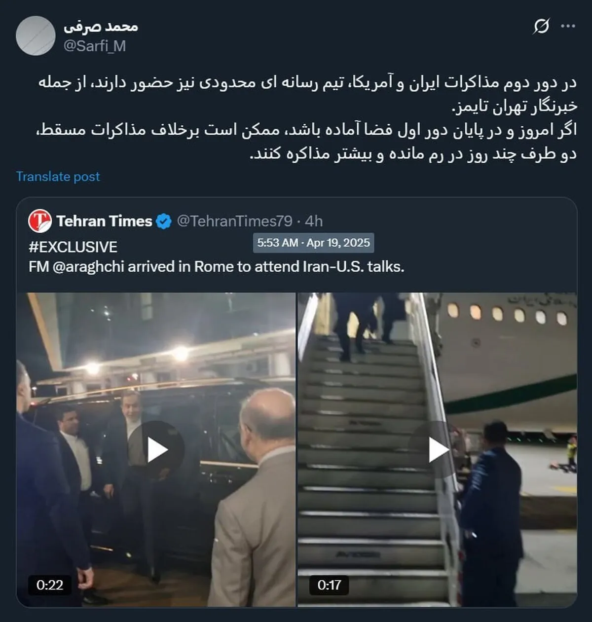 بهگفته سردبیر روزنامه تهران تایمز، گفتوگوهای جاری میان نمایندگان ایران و ایالات متحده ممکن است در رم فراتر از مدتزمان مذاکرات قبلی در مسقط ادامه یابد. وی با اشاره به فضای متفاوت مذاکرات جاری نسبت به دورهای پیشین، عنوان کرد: «این احتمال وجود دارد که برخلاف گفتوگوهای فشرده و کوتاه در عمان، اینبار طرفین چند روز در رم حضور داشته باشند و روند مذاکرات را با جزئیات بیشتری دنبال کنند.»