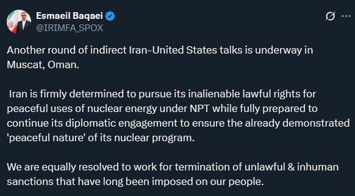 سخنگوی وزارت خارجه: دور دیگری از مذاکرات غیرمستقیم ایران و ایالات متحده در مسقط، عمان، در حال انجام است.