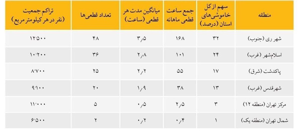 در حالی که جنوب تهران، به ویژه شهرری با ۳۲ درصد از کل خاموشیها و ۴۸ بار خاموشی، با مشکلات جدی مواجه است، مناطق شمالی تهران، از جمله منطقه یک، تنها یک درصد از خاموشیها را تجربه کردهاند و این منطقه تنها ۲ بار دچار خاموشی شده است.