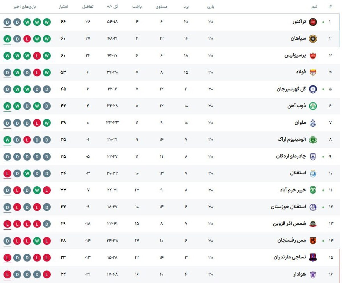 جدول رده بندی لیگ برتر بعد از پنج بازی پایانی