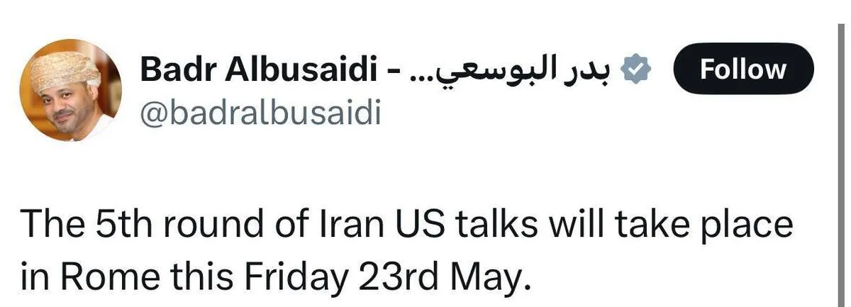 «بدر البوسعیدی» وزیر امور خارجه عمان روز چهارشنبه اعلام کرد که دور پنجم مذاکرات غیرمستقیم میان جمهوری اسلامی ایران و ایالات متحده آمریکا روز جمعه ۲۳ می (دوم خرداد) در شهر رم ایتالیا برگزار خواهد شد.