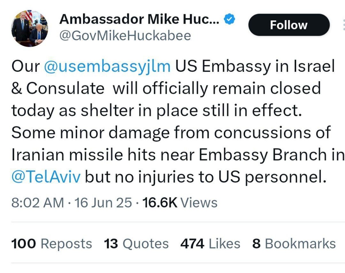 بر اثر موج انفجار ناشی از اصابت موشکهای ایرانی در نزدیکی سفارت ما در تلآویو، خسارت جزئی وارد شده، اما هیچ یک از کارکنان آمریکایی آسیب ندیدهاند.
