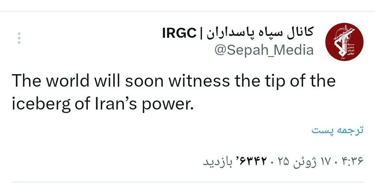 توئیت دقایق قبل سپاه پاسداران: جهان به زودی شاهد نوک کوه یخ قدرت ایران خواهد بود.
