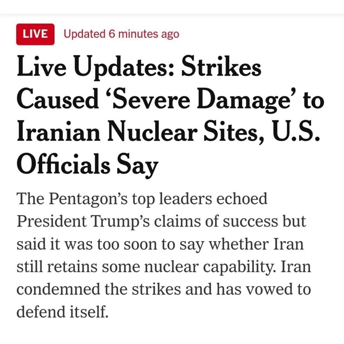 به گزارش تابناک، مقامات ارشد پنتاگون ضمن تکرار ادعا‌های ترامپ درباره موفقیت حملات، تأکید کرده‌اند که هنوز برای قضاوت درباره باقی‌ماندن ظرفیت هسته‌ای ایران، زود است.