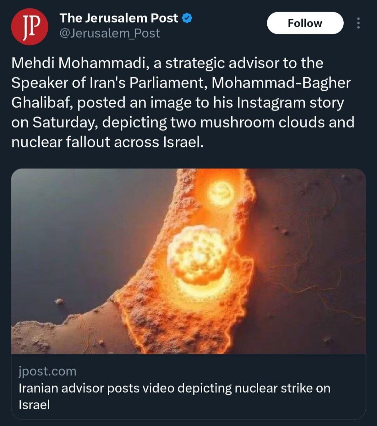 روزنامه اسرائیلی نوشت: استوری دو ابر قارچی شکل و بارشهای هستهای در سراسر اسرائیل، تهدید اتمی آشکار است.