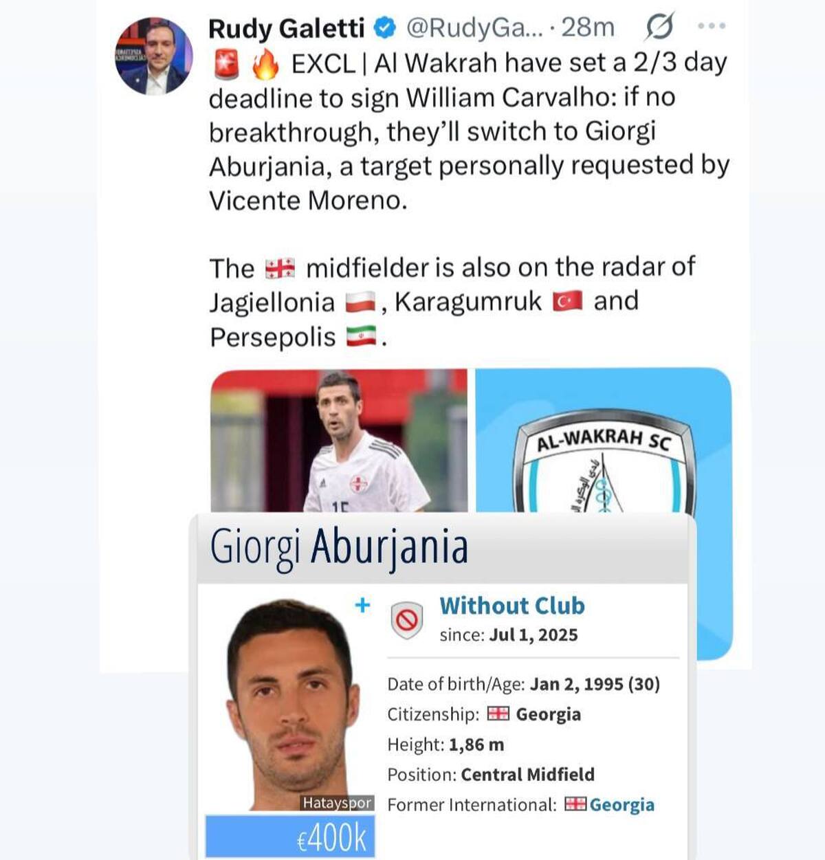رودی گالتی، خبرنگار مطرح ایتالیایی اعلام کرد پرسپولیس یکی از مشتری‌های گئورگی آبورجانیا هافبک ۳۰ ساله گرجستانی است.