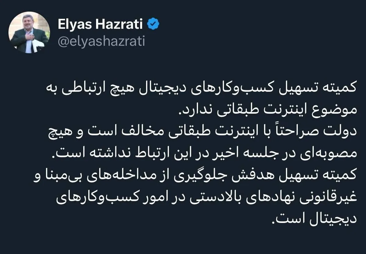 کمیته تسهیل کسبوکارهای دیجیتال هیچ ارتباطی به موضوع اینترنت طبقاتی ندارد. دولت صراحتاً با اینترنت طبقاتی مخالف است و هیچ مصوبهای در جلسه اخیر در این ارتباط نداشته است. کمیته تسهیل هدفش جلوگیری از مداخلههای بیمبنا و غیرقانونی نهادهای بالادستی در امور کسبوکارهای دیجیتال است.