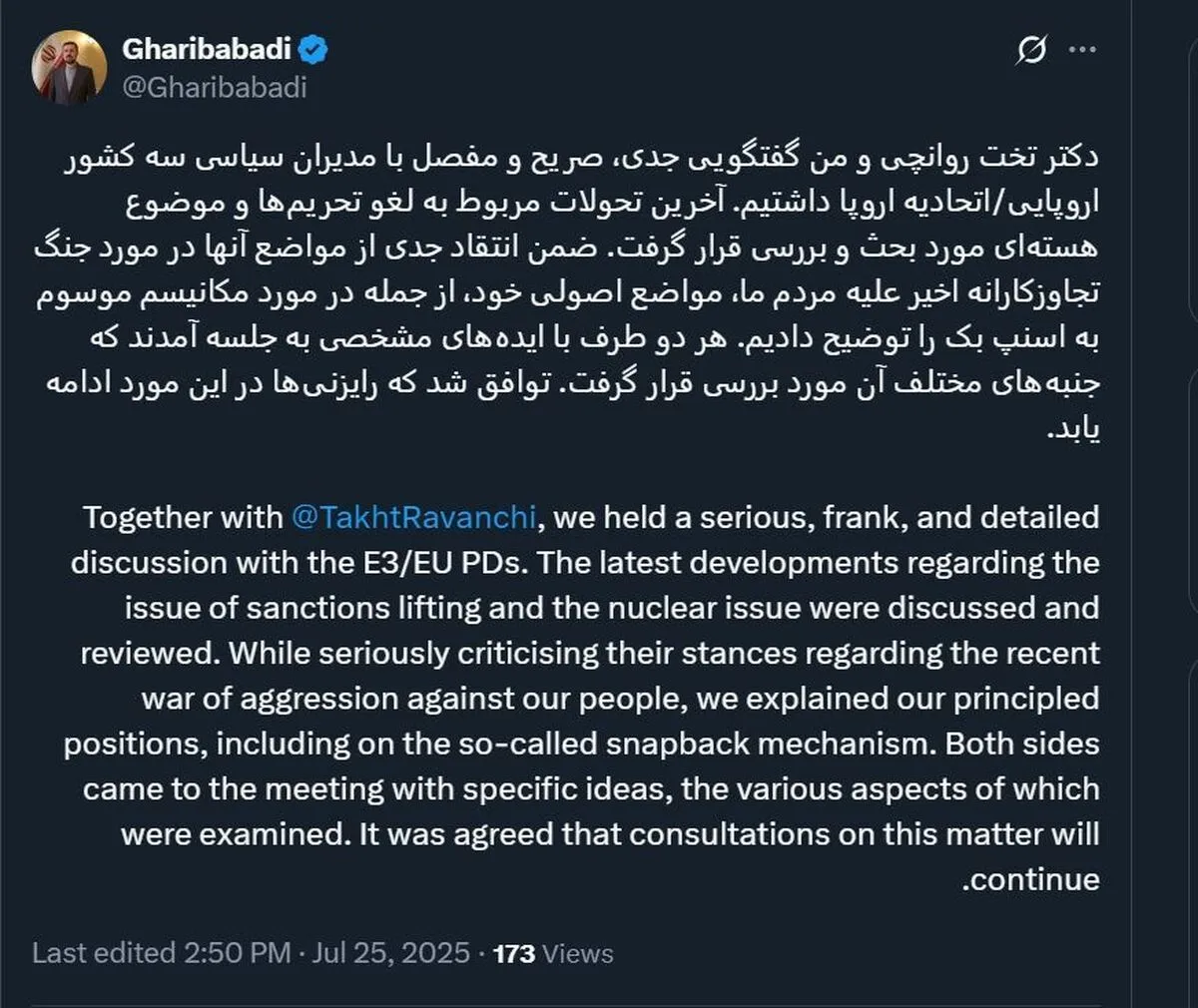 آخرین تحولات مربوط به لغو تحریمها و موضوع هستهای مورد بحث و بررسی قرار گرفت. ضمن انتقاد جدی از مواضع آنها در مورد جنگ تجاوزکارانه اخیر علیه مردم ما، مواضع اصولی خود، از جمله در مورد مکانیسم موسوم به اسنپ بک را توضیح دادیم.