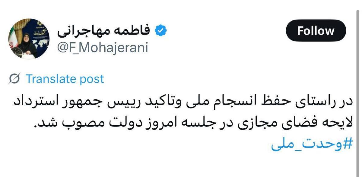 سخنگوی دولت اعلام کرد که استرداد لایحه فضای مجازی در جلسه امروز دولت مصوب شد. فاطمه مهاجرانی در حساب کاربری خود در شبکه اجتماعی ایکس نوشت: در راستای حفظ انسجام ملی وتاکید رییس جمهور استرداد لایحه فضای مجازی در جلسه امروز دولت مصوب شد.