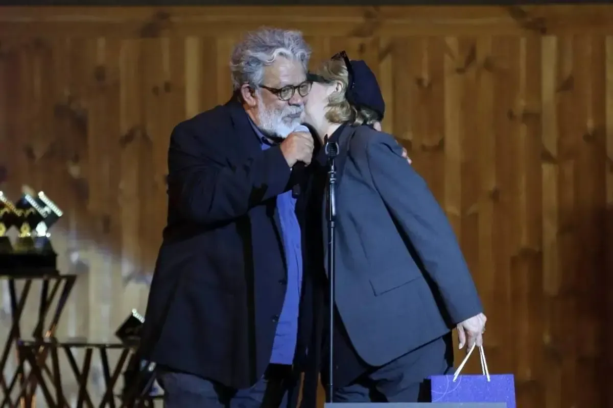 (ویدئو) بوسیدن حسن پورشیرازی توسط همسرش در جشن انجمن منتقدان و نویسندگان