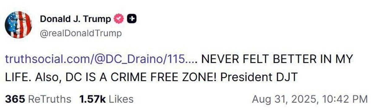 دونالد ترامپ، رئیسجمهور آمریکا با انتشار پیامی در تروث سوشال نسبت به شایعات پیرامون مرگش واکنش نشان داد و نوشت: "تا به حال در عمرم اینقدر حالم خوب نبوده است. در ضمن، واشنگتن دیسی یک منطقه عاری از جرم است. رئیسجمهور دونالد جی ترامپ. "