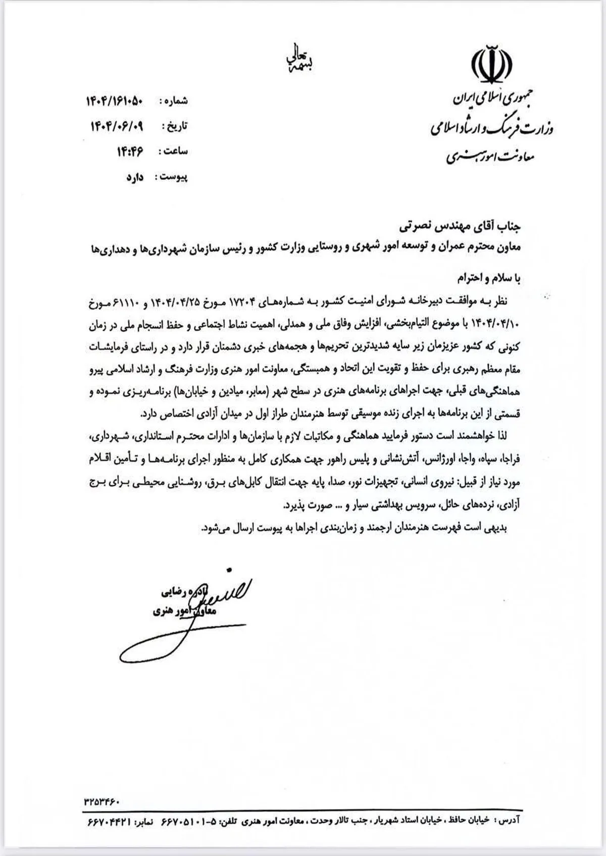 تصویری از نامه نادره رضایی، معاون وزیر ارشاد که نشان میدهد تنها ۴ روز پیش از برگزاری کنسرت همایون شجریان درخواست برگزاری آن را به شهرداری تهران ارائه کرده است.