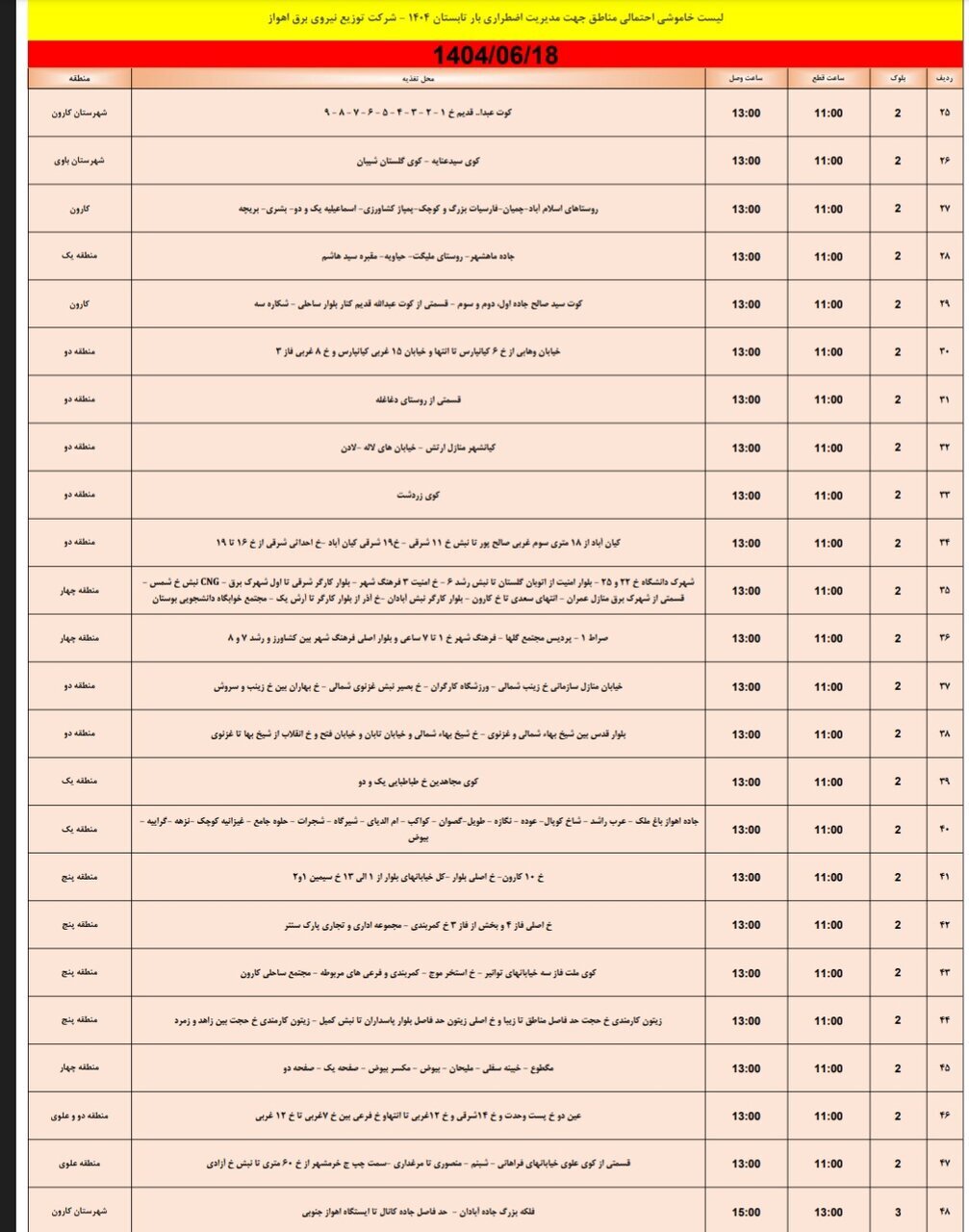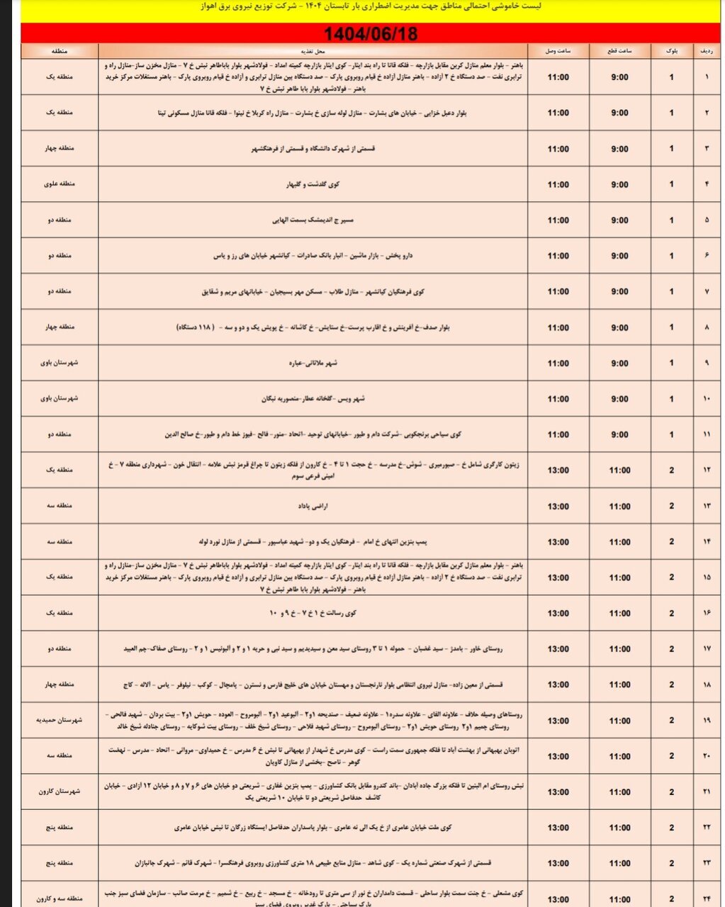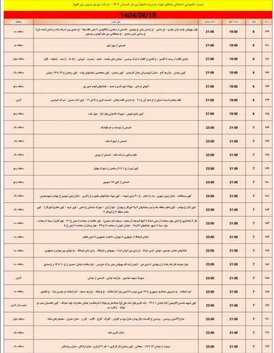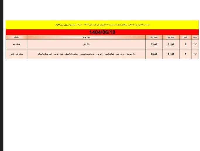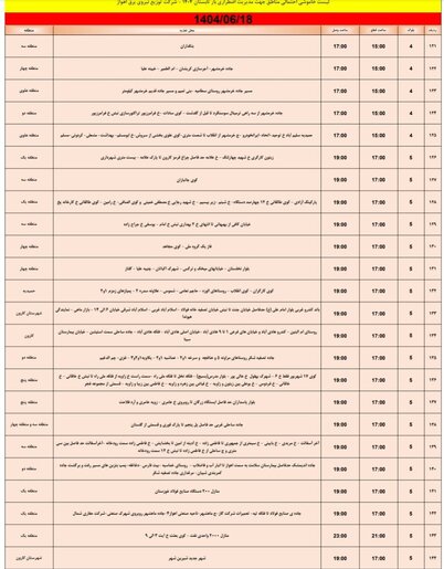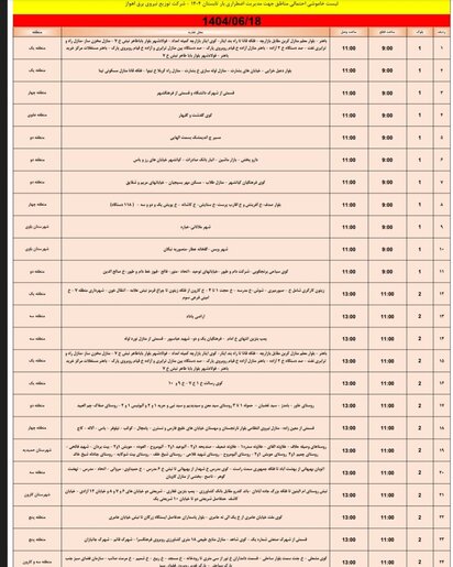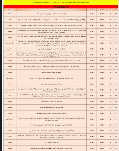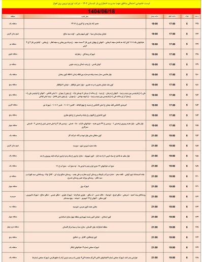 جدول خاموش برق اهواز امروز سه شنبه ۱۸ شهریور و فردا چهارشنبه ۱۹ شهریور را ببینید