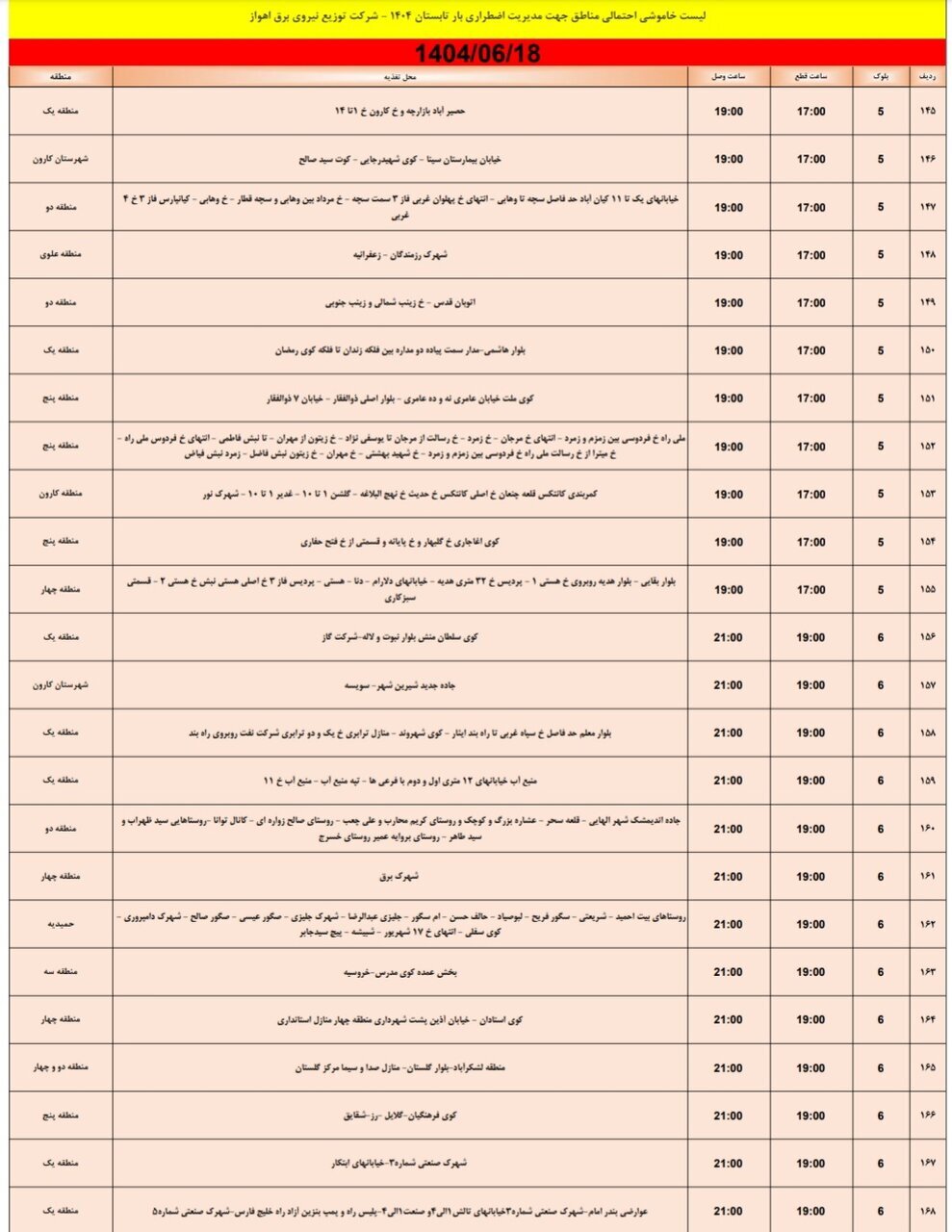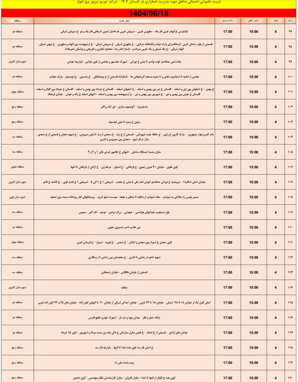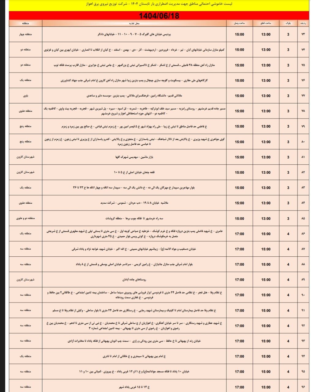جدول خاموش برق اهواز امروز سه شنبه ۱۸ شهریور و فردا چهارشنبه ۱۹ شهریور را ببینید